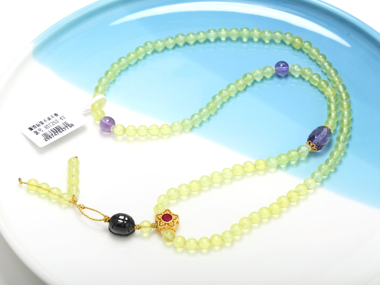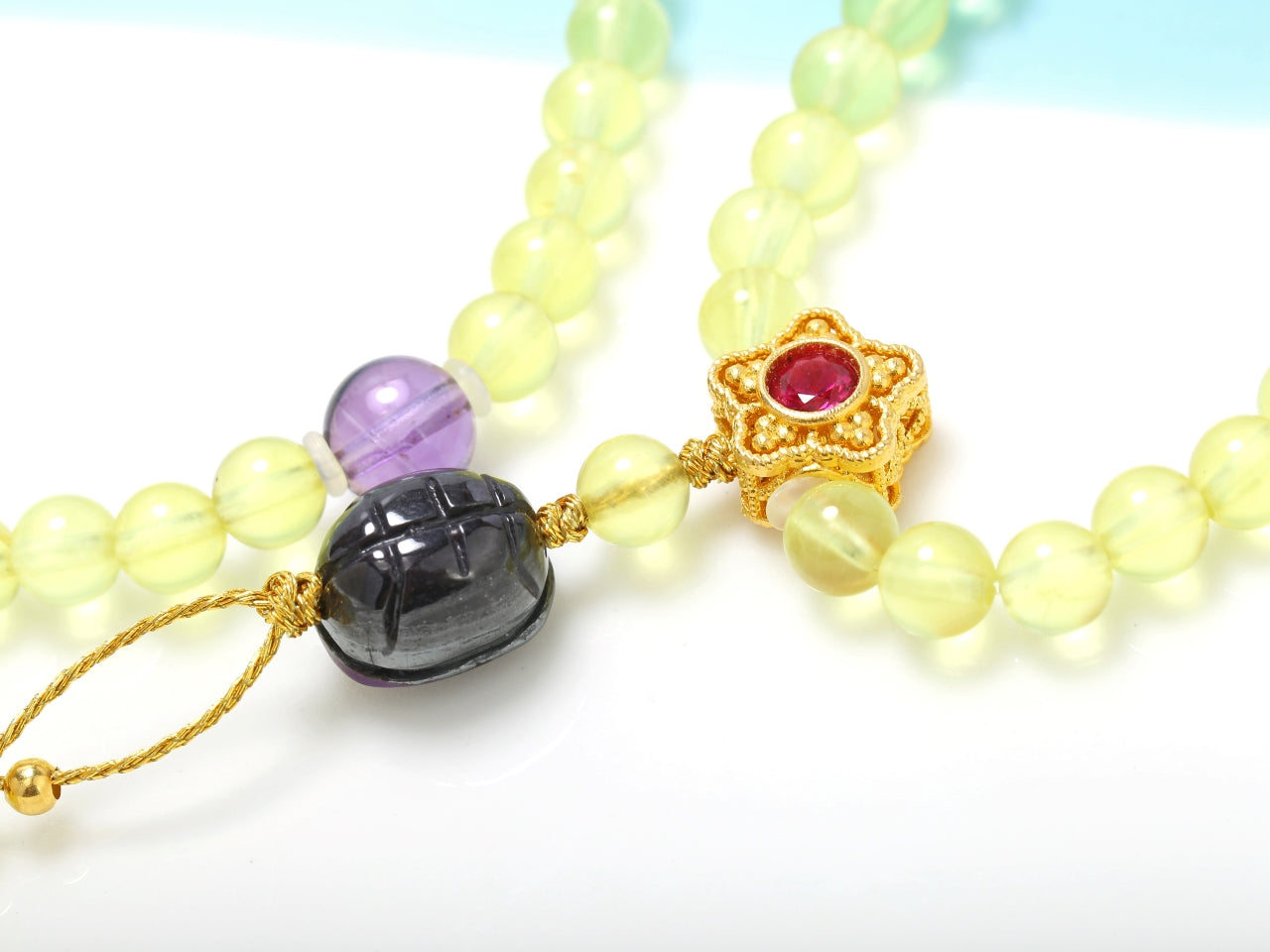 This versatile wrap piece features Golden Prehnite beads strung into a triple-loop design, allowing it to be worn as a bracelet or a choker-style necklace.