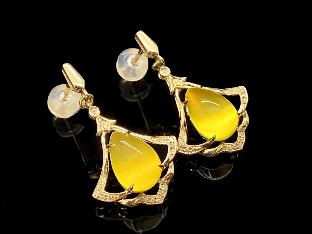 These exquisite earrings feature a pair of lustrous Golden Prehnite gemstones, glowing like sunlight captured in a drop. The pear-cut cabochons are nestled within delicately crafted golden frames, reminiscent of light filtering through sculpted leaves.