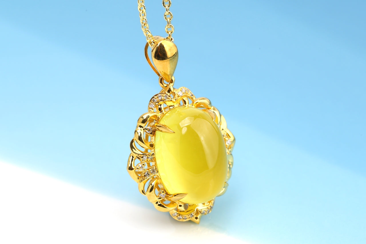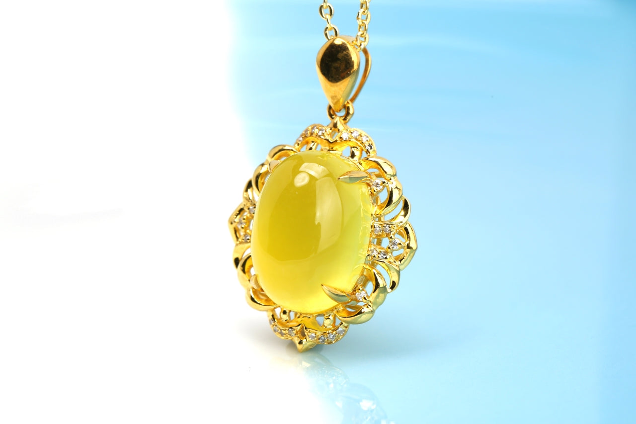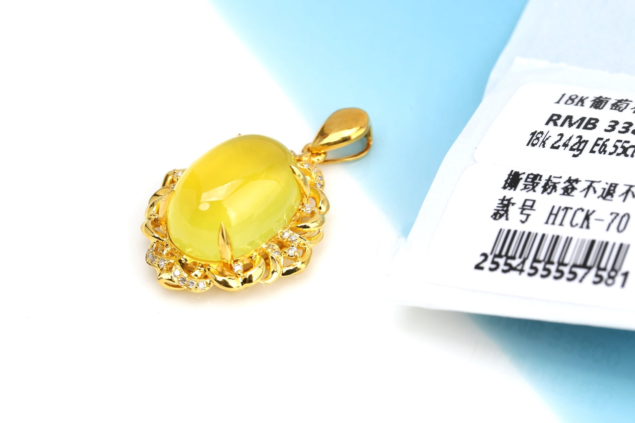 The rich golden-green hue of the gem glows like bottled sunlight, while the openwork design and drop-shaped bail offer elegance and airiness.