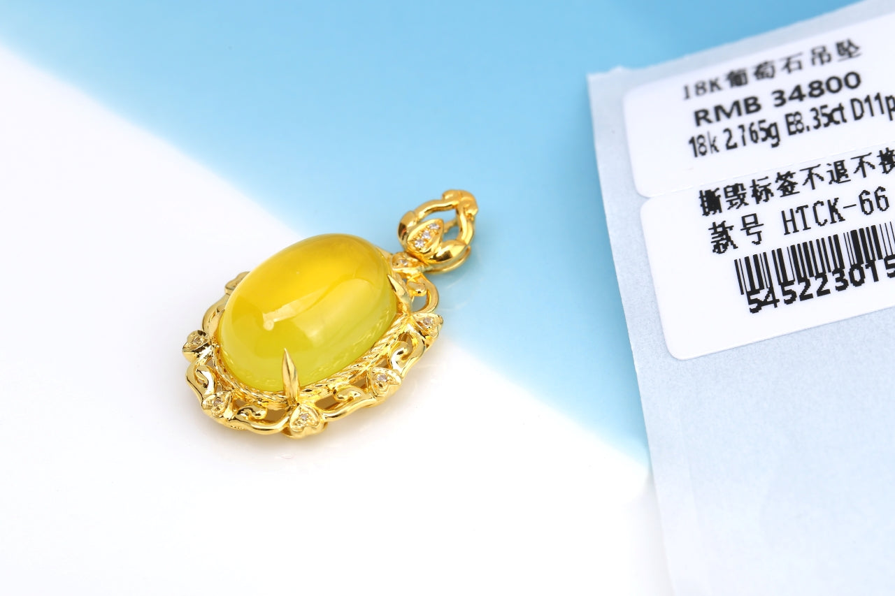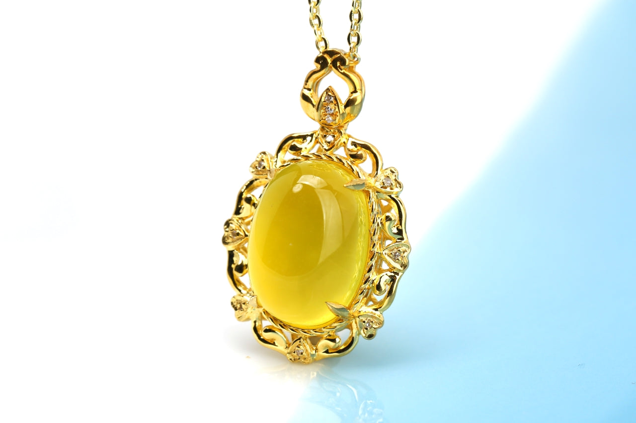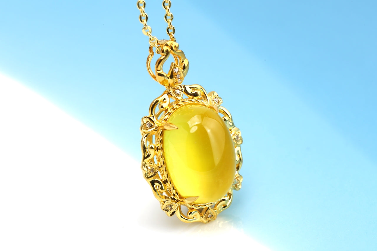This pendant showcases a luminous cabochon-cut Golden Prehnite with rich saturation and internal glow—set in an ornate vintage-style 18K gold filigree frame.